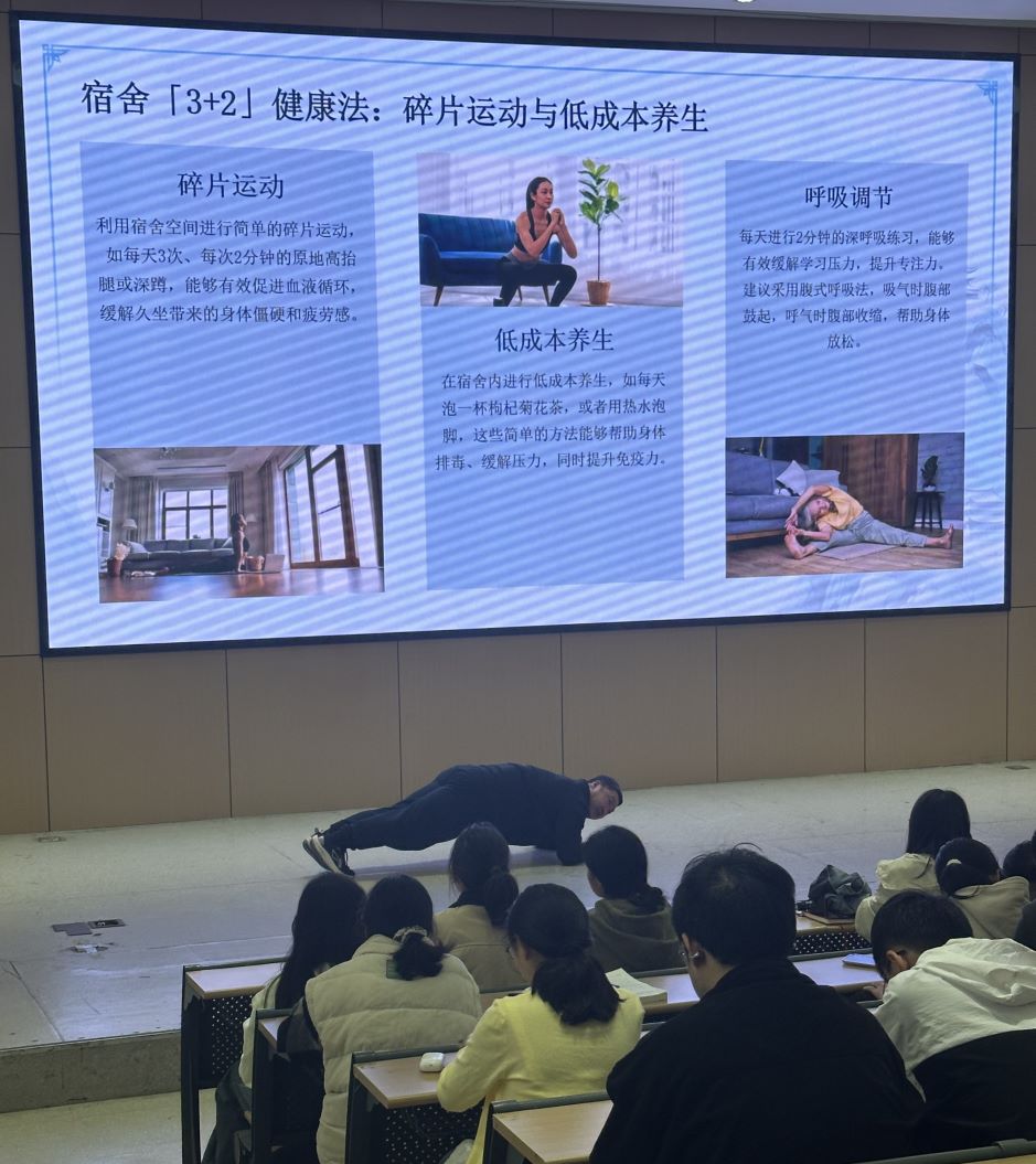 運(yùn)動養(yǎng)生部分同樣精彩紛呈。彭老師不僅講解了傳統(tǒng)養(yǎng)生功法如八段錦、五禽戲的健身原理,還特別針對久坐不動的"教室族"設(shè)計(jì)了一套課間放松操。"同學(xué)們記住,每坐45分鐘就要起來活動5分鐘,這幾個簡單的拉伸動作能有效預(yù)防頸椎病。"在他的帶領(lǐng)下,全場師生一起起身練習(xí),歡聲笑語充滿了整個教室。