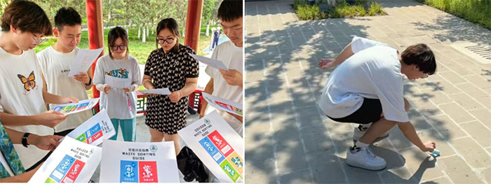 在實(shí)踐過程中,團(tuán)隊(duì)成員利用設(shè)計(jì)好的垃圾分類主題宣傳海報(bào),以及所學(xué)的垃圾分類相關(guān)知識(shí),以分組的形式為公園內(nèi)的游客進(jìn)行垃圾分類相關(guān)知識(shí)的科普宣傳。同時(shí),小組成員密切關(guān)注公園生態(tài)情況,撿拾地面垃圾并投放到對(duì)應(yīng)分類的垃圾桶內(nèi)。