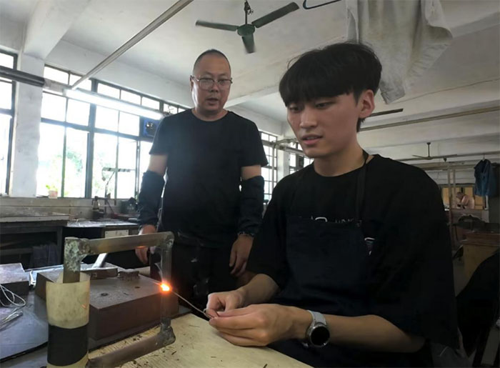 7月7日,在胡志成工作室,隊(duì)員們迎來了最期待的實(shí)踐環(huán)節(jié)——打鐵畫。分組后,有人選擇鍛打梅花,有人嘗試鏨刻蝴蝶,還有的挑戰(zhàn)"福"字創(chuàng)作。