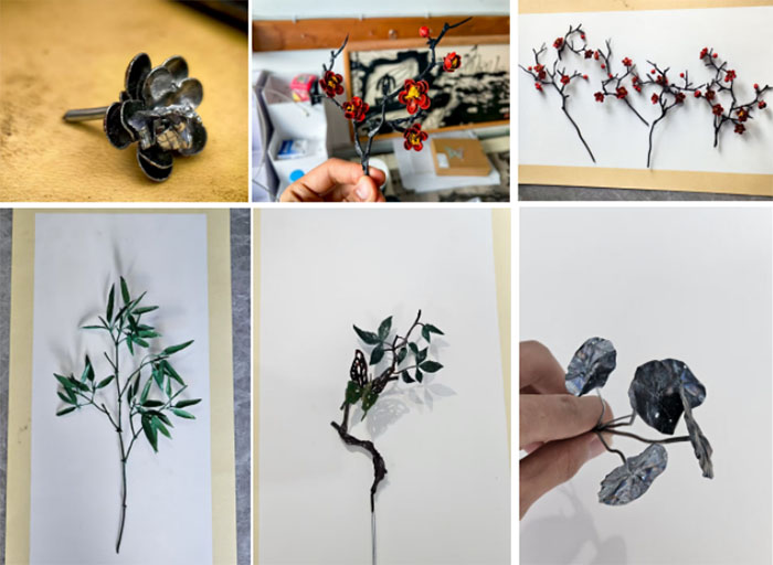 在大師工作室,隊(duì)員們有幸了解了鐵畫牡丹的完整制作過程。只見師傅拿出手機(jī),向我們展示鐵畫牡丹的成品照片,同時(shí)詳細(xì)講解制作過程。“首先要將設(shè)計(jì)圖分解成數(shù)十個(gè)部件,”他邊說邊拿起一片鐵制花瓣樣品,“每個(gè)部件都需要單獨(dú)鍛打成型。”師傅又取出幾片半成品花瓣,讓我們觸摸感受其紋理和厚度。“最后將所有部件精心組裝,這樣冷硬的鐵片就能呈現(xiàn)出柔美的花朵形態(tài)。”雖然沒能親眼目睹現(xiàn)場(chǎng)制作,但師傅生動(dòng)的講解和實(shí)物展示,仍讓我們對(duì)鐵畫工藝的精妙之處有了深刻理解。“每一件作品都要經(jīng)過上千次錘打,”師傅指著照片中花瓣的細(xì)膩紋路說,“這就是鐵畫的魅力所在。”