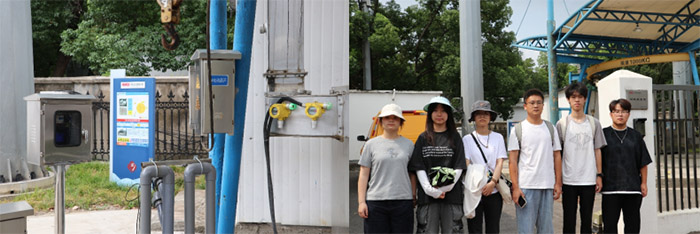 上午,實(shí)踐團(tuán)成員陳藝達(dá)、張?jiān)姁、姜凌維、任陽(yáng)陽(yáng)、尹李若、展一飛抵達(dá)白蕩凈水廠。在水廠專業(yè)人員的引導(dǎo)下,團(tuán)隊(duì)首先聚焦城市“地下血脈”——污水收集運(yùn)輸系統(tǒng)。專業(yè)人員現(xiàn)場(chǎng)講解了雨污分流井的辨識(shí)(圓井污水、方井雨水),并演示了管網(wǎng)運(yùn)維的關(guān)鍵環(huán)節(jié):規(guī)范開啟井蓋、安裝防墜網(wǎng)、進(jìn)行污水采樣及快速水質(zhì)評(píng)估(圖1)。這堂“管網(wǎng)一線課”讓同學(xué)們直觀感受到城市水系統(tǒng)前端運(yùn)維的精細(xì)與安全要求。隨后,團(tuán)隊(duì)實(shí)地考察了朝紅路無(wú)人值守泵站(圖2),其智能化運(yùn)行模式讓同學(xué)們切身感受到水務(wù)行業(yè)向自動(dòng)化、智慧化邁進(jìn)的堅(jiān)實(shí)步伐。