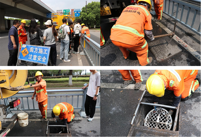 緊接著,觀察團(tuán)移步至市政管道養(yǎng)護(hù)現(xiàn)場(chǎng)。排水公司的養(yǎng)護(hù)工人身著橙色反光服,頭戴安全帽,在烈日下對(duì)雨水管道進(jìn)行清通作業(yè)。一組工人高效清除雨水井內(nèi)淤積的落葉、泥沙;另一組則操作搭載高壓清洗設(shè)備的工程車進(jìn)行深度疏通。現(xiàn)場(chǎng)分工明確:一人精準(zhǔn)操控設(shè)備,一人俯身探查井口,專人觀察疏通效果——當(dāng)水流從雨水井口噴涌而出,標(biāo)志著這段城市“毛細(xì)血管”恢復(fù)暢通(圖3)。工人們用汗水守護(hù)城市“血脈”順暢,其敬業(yè)精神深深觸動(dòng)了師生。
