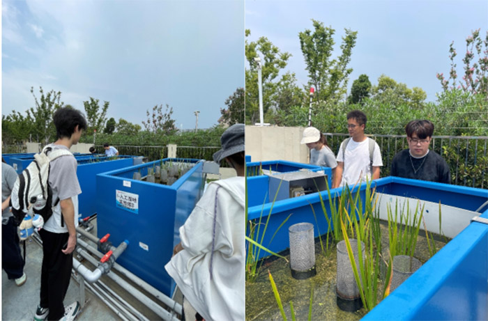 科技賦能不僅體現(xiàn)在生產(chǎn)工藝,更延伸至創(chuàng)新研究。在廠區(qū),同學(xué)們欣喜地發(fā)現(xiàn)了本校學(xué)長(zhǎng)學(xué)姐的科研成果——人工濕地處理新污染物的中試項(xiàng)目(圖5)。研究者們依托水廠真實(shí)環(huán)境,將實(shí)驗(yàn)室成果放大進(jìn)行中試驗(yàn)證,在實(shí)踐中檢驗(yàn)效能、發(fā)現(xiàn)問題、迭代優(yōu)化。這一產(chǎn)學(xué)研緊密結(jié)合的實(shí)例,為低年級(jí)同學(xué)展現(xiàn)了專業(yè)研究的廣闊前景與應(yīng)用價(jià)值,極大地拓寬了視野,也讓大家對(duì)未來(lái)的學(xué)習(xí)與研究方向有了更清晰的規(guī)劃。