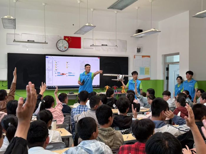 在互動環(huán)節(jié),宣講團成員們帶來了航模飛機、四旋翼無人機和各斗機器人模型。“原來遙控飛行背后的原理是這樣的!”、“機器人的搏斗是怎么實現(xiàn)的?”同學們圍攏在模型前,志愿者們耐心解答同學們的問題,講解模型的原理。“原來課本里的物理知識能這樣應(yīng)用到實際!”一位參與模型操作的同學興奮地說。此次互動,是“兩彈一星”精神的生動詮釋,更在雪域少年的心中深深埋下了探索真理、勇攀科技高峰的火種。