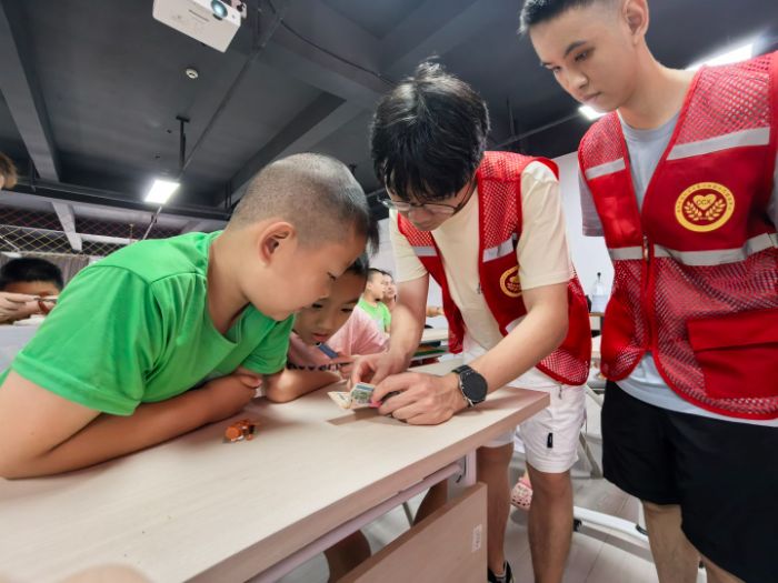 “竹編是傳統(tǒng)手藝,現(xiàn)在我教你們做小船。”竹編老師帶來(lái)竹片,教孩子們交叉編織船身、做船帆。志愿者們耐心指導(dǎo)孩子們穿竹片,幫他們改正錯(cuò)誤。當(dāng)小船編好后,大家拿起自己的小船在空中揮舞,傳統(tǒng)技藝的溫度,在指尖的竹片里慢慢傳遞。