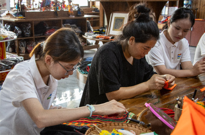 實(shí)踐團(tuán)的最后一站來到花間刺繡手工作坊。五彩絲線在繡娘們手中翻飛,銀針起落間,彝族圖騰、山間花鳥栩栩如生。繡娘們熱情地教隊(duì)員們基礎(chǔ)繡法,帶領(lǐng)大家感受針線與布料的奇妙交融。在介紹之下了解到手工作坊成立后,不僅為當(dāng)?shù)貗D女提供了就業(yè)崗位,更讓越來越多的人重拾這門手藝。