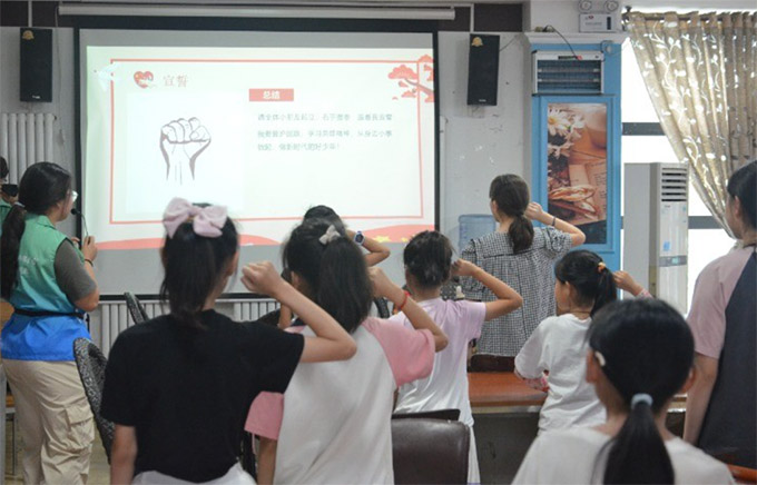 圖為志愿者帶著小朋友們進(jìn)行莊嚴(yán)宣誓 張智坤 供圖