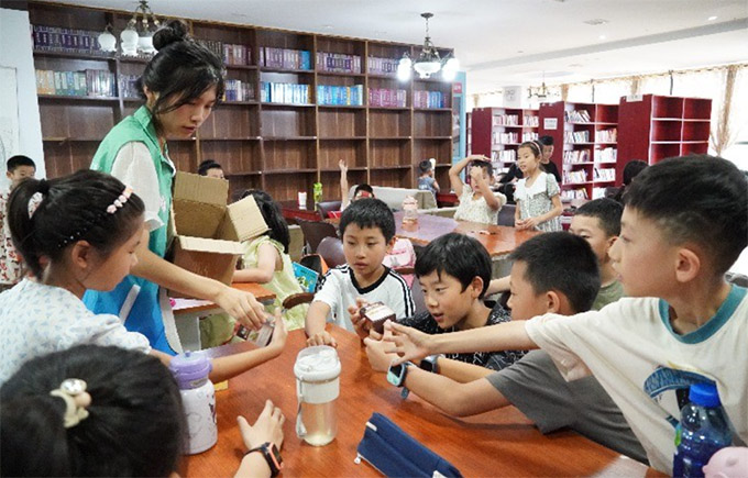 圖為志愿者給小朋友們分發(fā)教具 張智坤 供圖