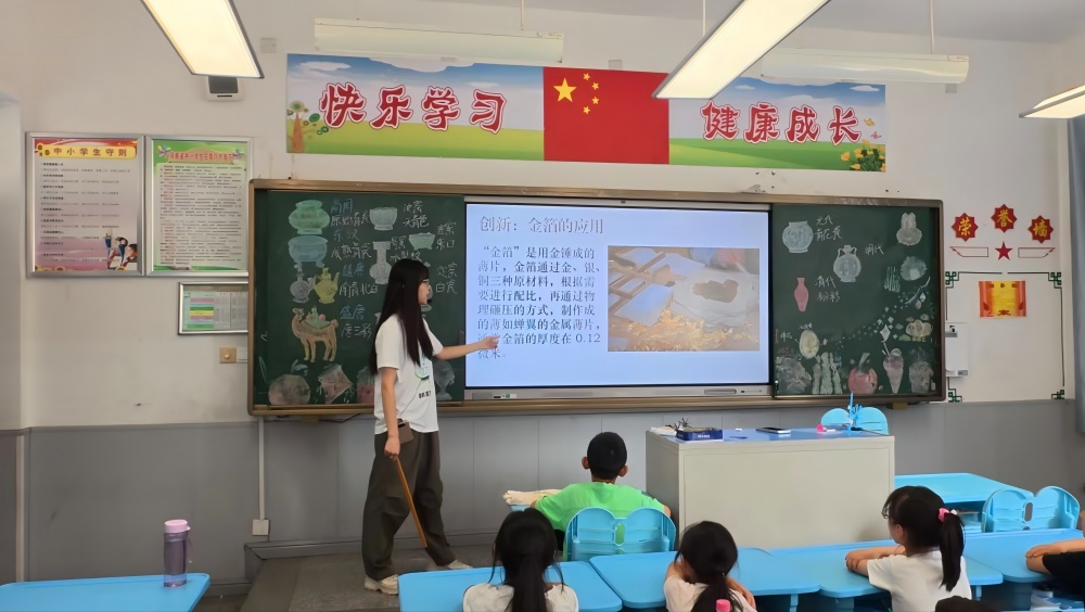 為擴(kuò)大金箔文化的傳播范圍,實(shí)踐團(tuán)還面向河南省的小朋友們開展了生動(dòng)有趣的非遺金箔教學(xué)活動(dòng)。團(tuán)隊(duì)成員通過(guò)圖片展示、視頻講解、互動(dòng)問(wèn)答等方式,向孩子們介紹金箔的歷史淵源、制作工藝及文化價(jià)值,在他們心中播下傳承非遺文化的種子。