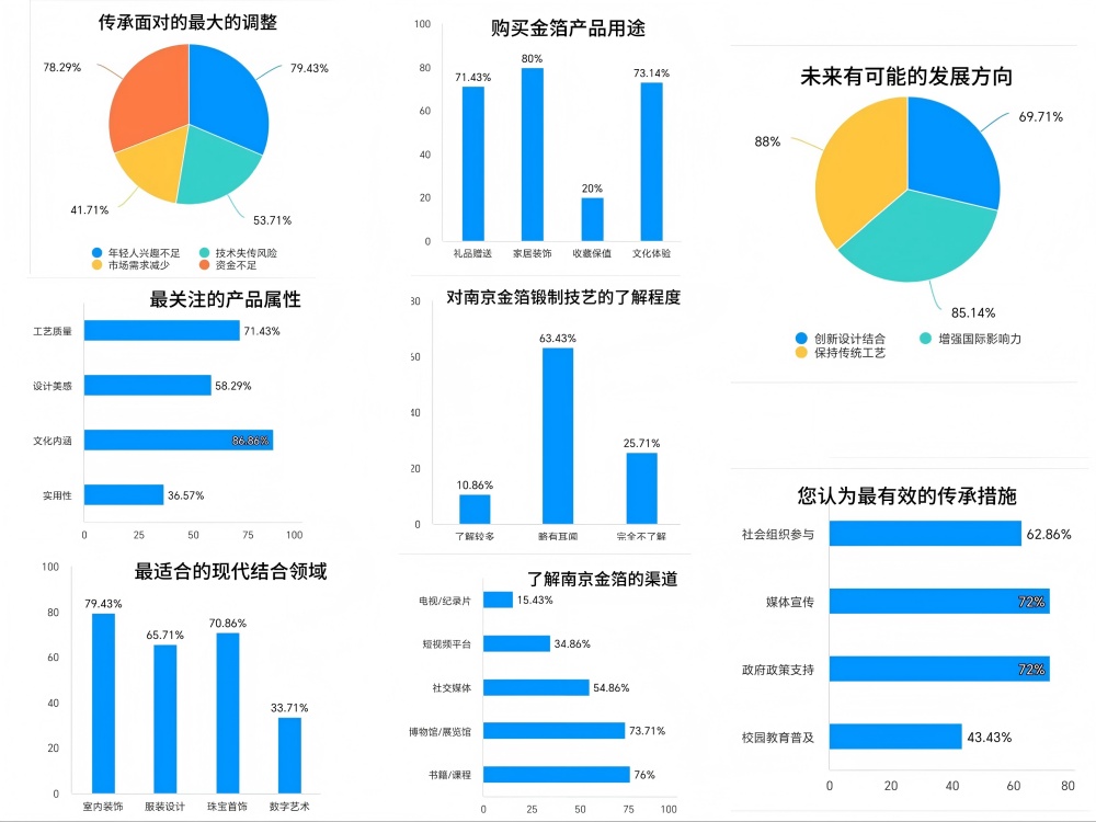 實(shí)踐活動(dòng)伊始,團(tuán)隊(duì)聚焦公眾對(duì)南京金箔的認(rèn)知現(xiàn)狀,精心設(shè)計(jì)涵蓋了解程度與渠道、產(chǎn)品屬性與用途、工藝與傳承、現(xiàn)代結(jié)合與發(fā)展方向以及推廣方式等維度的線上調(diào)查問(wèn)卷,借助社交媒體平臺(tái)、校園社群等多渠道投放,共收集175份有效問(wèn)卷。數(shù)據(jù)顯示,僅10.86%的受訪者對(duì)南京金箔鍛制技藝了解較多,63.43%的人略有耳聞,25.71%的人完全不了解;76%的人通過(guò)書籍或課程了解金箔文化,54.86%的人通過(guò)社交媒體接觸相關(guān)信息。這一調(diào)研結(jié)果為團(tuán)隊(duì)后續(xù)實(shí)踐活動(dòng)的精準(zhǔn)開展提供了科學(xué)依據(jù),也凸顯了加強(qiáng)金箔文化普及的迫切性。