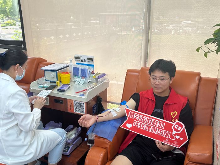 圖為志愿者在獻(xiàn)血站無償獻(xiàn)血“禁毒亮劍青春行,防艾長城眾志凝”禁毒防艾實(shí)踐團(tuán)攝