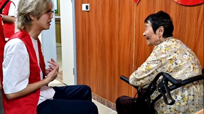 圖為志愿者陪伴老人聊天“禁毒亮劍青春行,防艾長城眾志凝”禁毒防艾實(shí)踐團(tuán)攝