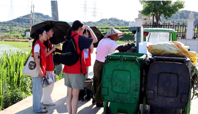 在走訪過程中,團(tuán)隊(duì)成員在田間路上與垃圾回收人員攀談,了解到智能垃圾分類的運(yùn)行機(jī)制。垃圾回收員介紹道:“我們村早晚收兩次垃圾,村民都很自覺,既方便又高效。”他還補(bǔ)充說,村子實(shí)行‘四定一撤’,每個(gè)垃圾桶都有二維碼,掃描后能自動記錄垃圾重量并計(jì)入積分。