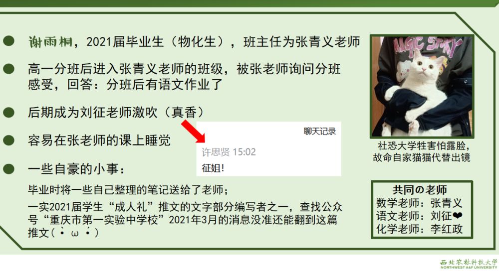 聽聞西北農(nóng)林科技大學(xué)每年寒假都會舉辦“回訪母校”活動。進入大學(xué)以來,我一直希望能有一個“正大光明”的理由讓我重游高中故地,這次算是如愿了。2023年1月的這個寒假,我成功報名了這年的“回訪母校”活動并找到了我的隊員——與我來自同一所高中的羅銳欣同學(xué)。我們組成了團隊,打算聯(lián)系各自的班主任,給重慶市第一實驗中學(xué)校的學(xué)弟學(xué)妹們來一次充滿“干貨”的宣講。