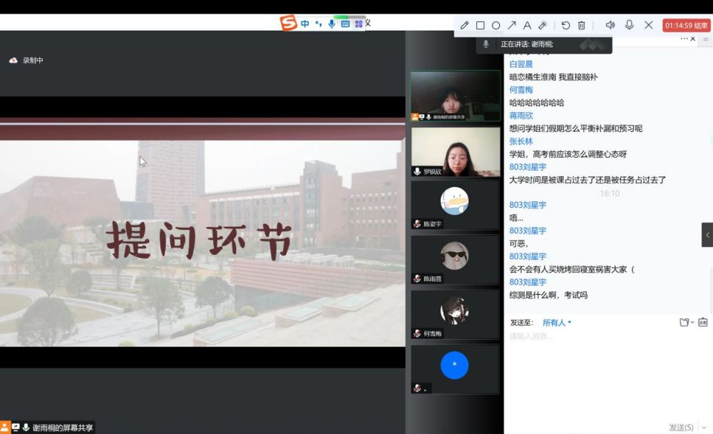 學(xué)弟學(xué)妹們最激動的還是互動環(huán)節(jié)。我們給他們分享一些學(xué)長學(xué)姐們代代“傳承”下來的各科老師的表情包。出于對老師隱私的保護這里就不放出來了。以及最后的提問環(huán)節(jié),我們本以為沒多少人會在聊天框提問的,結(jié)果大家居然都很積極地在和我們互動,且從他們提出的問題能看出,他們有在很認真地聽我們宣講。