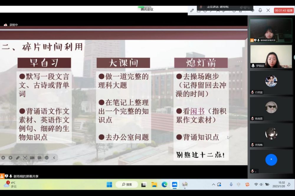 宣講的重頭戲是高考經(jīng)驗分享環(huán)節(jié),除了有關(guān)高考的物質(zhì)準(zhǔn)備和心態(tài)調(diào)整這些常規(guī)的內(nèi)容,我們還結(jié)合一實的作息安排,提出了對于一些碎片時間的規(guī)劃建議。記得在我還是高中生的時候,我的物理老師說過,如果想和同學(xué)拉開差距,就應(yīng)當(dāng)利用好每個不出操的大課間的半小時。比如利用大課間的二十五分鐘做一道完整的理科大題,或者去辦公室問老師平時沒有弄懂的題目等。