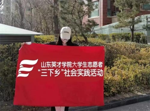 “奮進”實踐團在社區(qū)進行活動宣傳時與三下鄉(xiāng)旗幟的合影留念