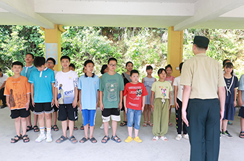 志愿者老師馮瑾昊教導(dǎo)學(xué)生們軍營(yíng)小游戲的規(guī)則