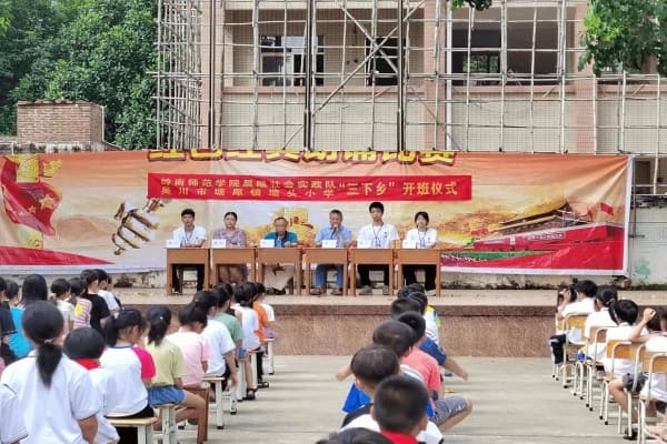 2023年7月10日上午8:30,嶺南師范學(xué)院數(shù)學(xué)與統(tǒng)計學(xué)院的“晨曦”社會實踐隊在吳川市塘頭村塘頭小學(xué)舉行開班儀式。特邀塘頭村村長凌東旭、塘頭小學(xué)校長凌舒雯和指導(dǎo)老師歐伯群出席并發(fā)表講話。