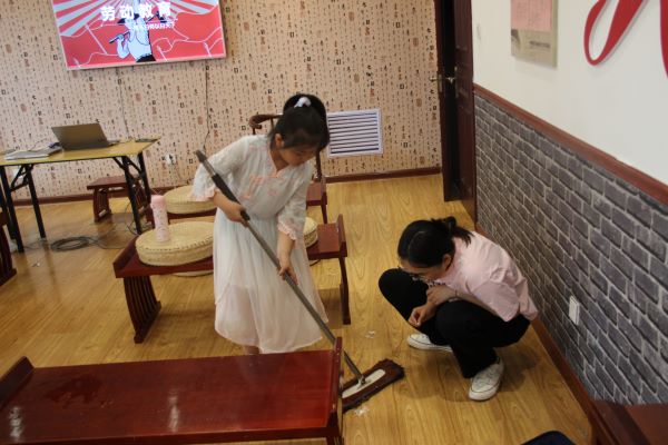 同學(xué)們分工十分明確,兩個人擦桌子,另外兩個人打掃桌子周圍的地面。有的同學(xué)對于做家務(wù)并不熟悉,比如不能靈活地使用掃把或拖把,周圍的同學(xué)們和老師都會熱情地幫助他們,讓他們學(xué)習(xí)各種工具的使用方法。