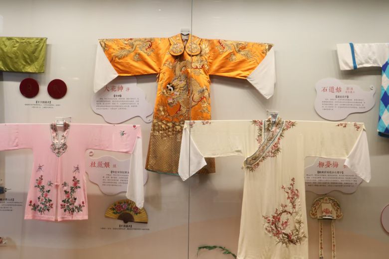 踏入大廳,精美的昆曲戲服陳列墻瞬間吸引目光。杜麗娘的粉色戲服、柳夢(mèng)梅的素色長(zhǎng)衫、大花神的龍紋戲服等,在玻璃展柜中靜靜訴說(shuō)著角色故事。同學(xué)們駐足聆聽(tīng)講解,從戲服的色彩搭配、刺繡紋樣里,解碼昆曲“以衣塑形、以形傳情”的藝術(shù)邏輯,感受傳統(tǒng)服飾與戲曲角色融合的獨(dú)特審美。