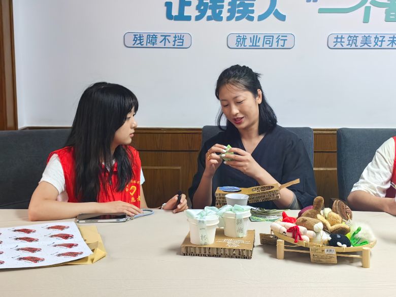 殘疾人之家是第一道港灣,真正走向社會還需專業(yè)力量。”善達未來助殘服務中心正搭建就業(yè)轉化橋梁。面對肢體障礙、聽障、心智障礙等多元群體,善達未來摸索出適配路徑:為聽障設計師組建專屬項目組,由“橋梁”主管協(xié)調(diào)溝通;為外向心智障礙者開拓市集崗位,采用“聽障+心智障礙”融合搭檔模式。其開發(fā)的“聊贈一杯春”文創(chuàng)茶品,包裝附二維碼展示殘障伙伴工作場景,環(huán)保小包裝設計在市集廣受歡迎,讓殘障伙伴的努力被社會看見。負責人陳咪老師直言: