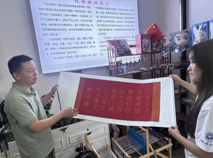 陶師傅還向我們展示了織在紅安大布上的《黃安謠》。陶師傅將《黃安謠》的詞句化作布面上的星火圖騰——用赭紅鋪成歷史底色,以金黃勾勒出“小小黃安,人人好漢,銅鑼一響四十八萬,男將打仗,女將送飯”的字樣,讓飛梭在經(jīng)緯間穿梭出永不褪色的革命記憶。
