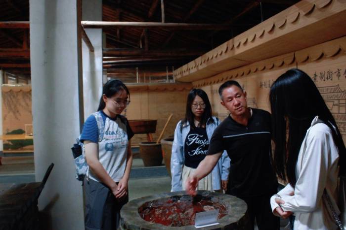 在古法釀醋工坊,實(shí)踐團(tuán)成員在傳承人的指導(dǎo)下親手體驗(yàn)了翻醅這一傳統(tǒng)工藝,他們循古法翻動(dòng)醅料,感受原料質(zhì)地的變化,在汗水與谷物的清香中,真切體會(huì)到傳統(tǒng)釀造“一分耕耘一分滋味”的堅(jiān)守,感受到“手作”的溫度。