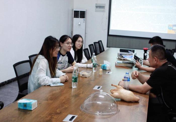 圖為非遺工坊負(fù)責(zé)人馬曉宇、非遺傳承人馬兆凱為實(shí)踐團(tuán)成員講解南京板鴨、鹽水鴨的相關(guān)知識(shí)。趙悅彤供圖