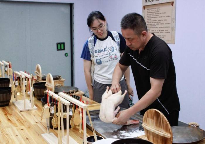 圖為非遺傳承人馬兆凱向?qū)嵺`團(tuán)成員展示南京板鴨、鹽水鴨制作技藝。趙悅彤供圖