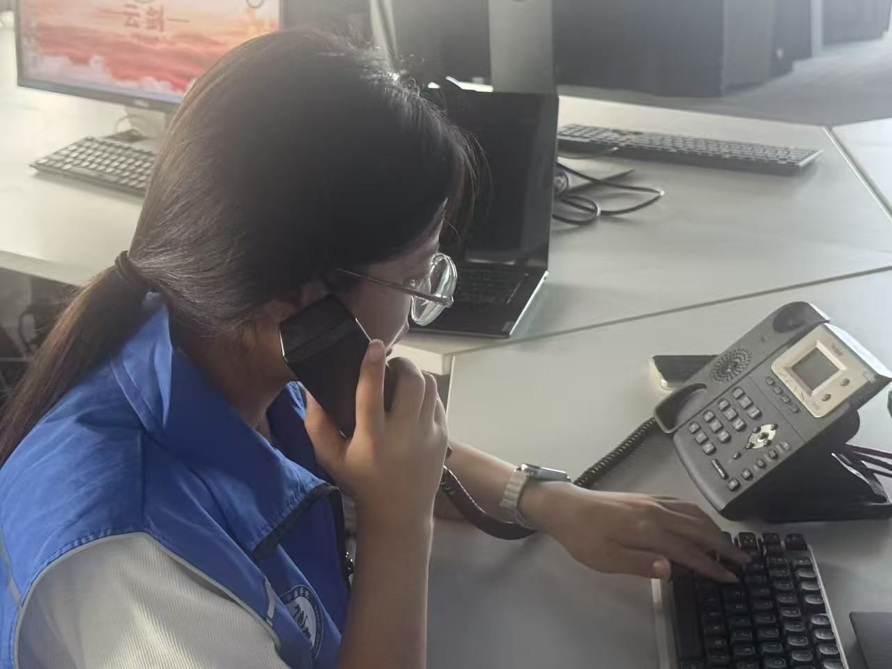 (圖為實踐隊成員在預(yù)警勸阻崗位接聽電話 “法盾防詐”實踐隊 胡雅淇 供圖)
