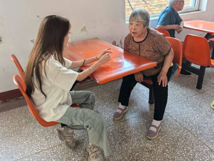 踏入敬老院,同學們便立即投入到開展志愿活動的熱情中。敬老院走廊的安靜因為同學們的青春力量而注入溫暖。同學們有的陪老人漫步聽他們介紹敬老院的點滴與生活,有的圍坐在老人身旁,傾聽他們講述歲月沉淀的故事,用真誠的交流驅(qū)散他們內(nèi)心的顧忌。食堂里,橙色的餐桌見證著溫暖互動,學生們專注地聽著那些過去的回憶,青春與暮年的對話,傳遞著跨越代際的理解與關(guān)懷。