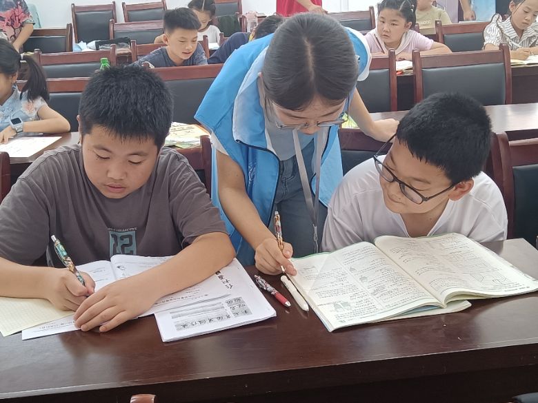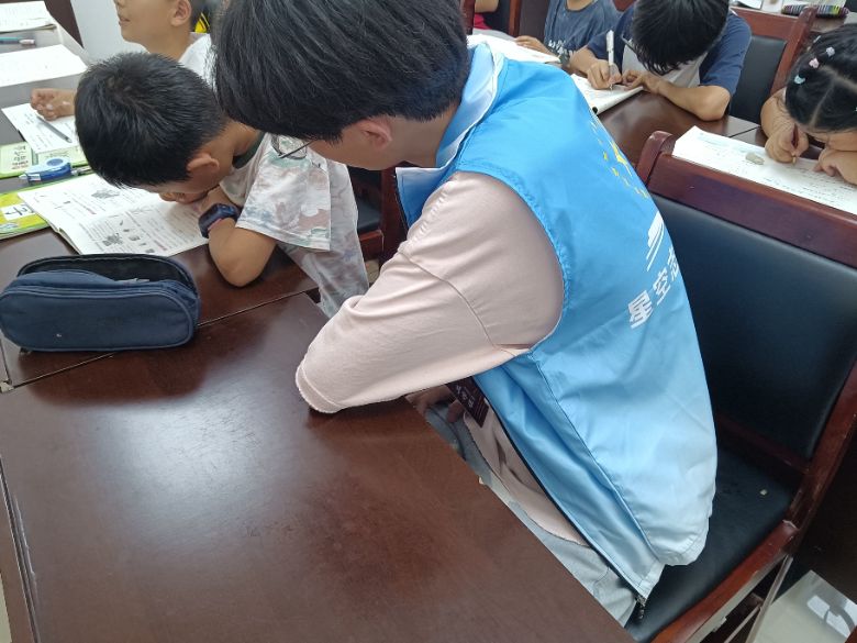 張同學(xué)則專注于語(yǔ)文輔導(dǎo),面對(duì)一群嘰嘰喳喳、充滿好奇心的小朋友,她溫柔地引導(dǎo)著大家。在輔導(dǎo)一篇描寫夏天的課文時(shí),她逐字逐句帶著小朋友分析, 為了鍛煉小朋友們的語(yǔ)言表達(dá)能力,她鼓勵(lì)大家大聲朗讀,還會(huì)糾正大家的發(fā)音和語(yǔ)調(diào)。有的小朋友一開始聲音很小,李同學(xué)就蹲下來(lái),微笑著說(shuō):“你的聲音很好聽(tīng)哦,大聲讀出來(lái),讓老師和小伙伴們都能聽(tīng)到!” 在她的鼓勵(lì)下,小朋友們的聲音越來(lái)越洪亮,教室里充滿了朗朗讀書聲。輔導(dǎo)過(guò)程中,李同學(xué)還針對(duì)每個(gè)孩子的朗讀情況,記錄下問(wèn)題,以便后續(xù)有針對(duì)性地指導(dǎo)。