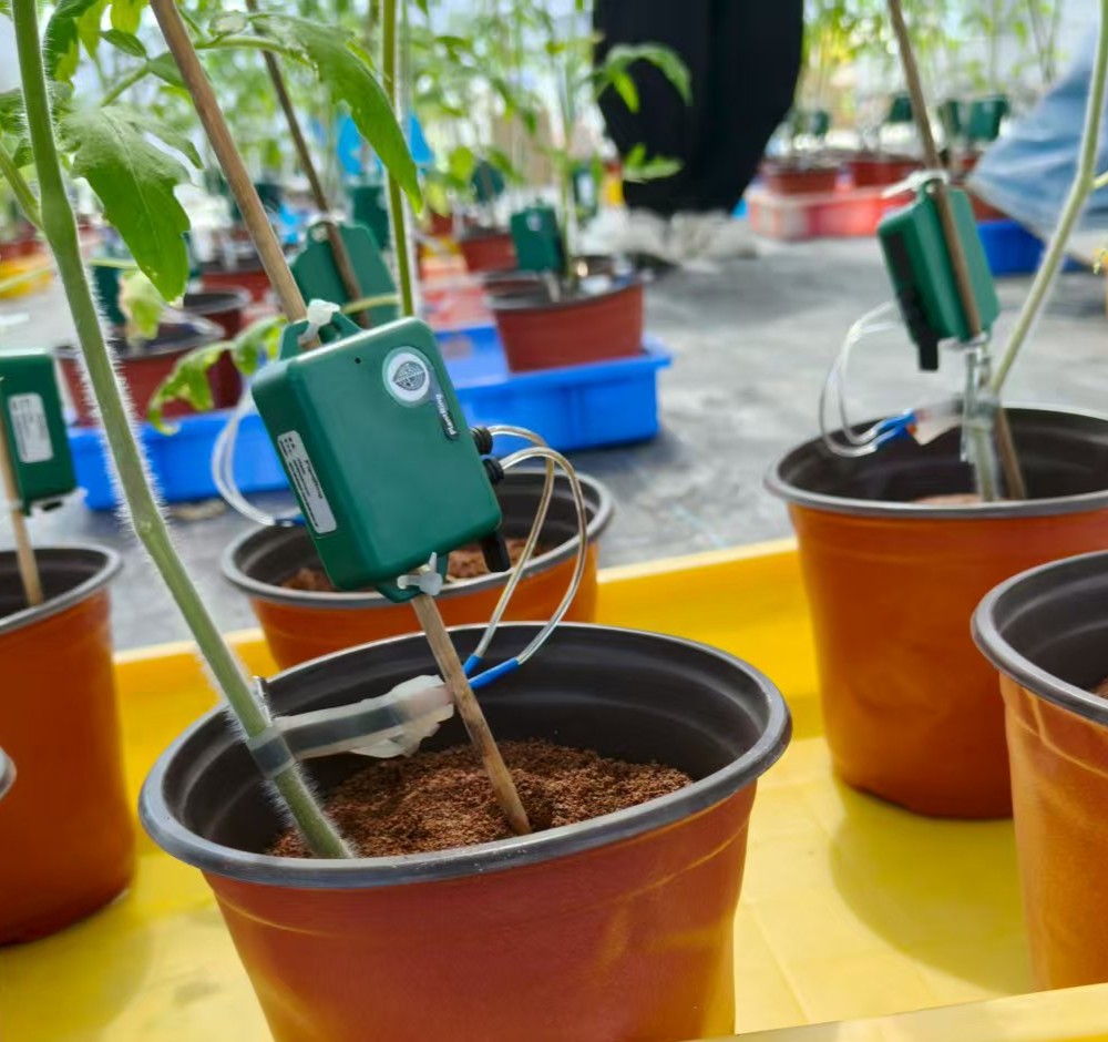 作為該P(yáng)lantRing傳感器相關(guān)論文的第一作者,呂老師熟稔地為團(tuán)隊(duì)成員講解它的科技原理。傳感器纏繞在莖部,能實(shí)時(shí)捕捉莖直徑的細(xì)微變化,再把這些變化轉(zhuǎn)化為植物的生理信號(hào)并上傳至云端,為觀測者實(shí)時(shí)提供精確數(shù)據(jù),幫助制定并反饋精準(zhǔn)的灌溉策略。