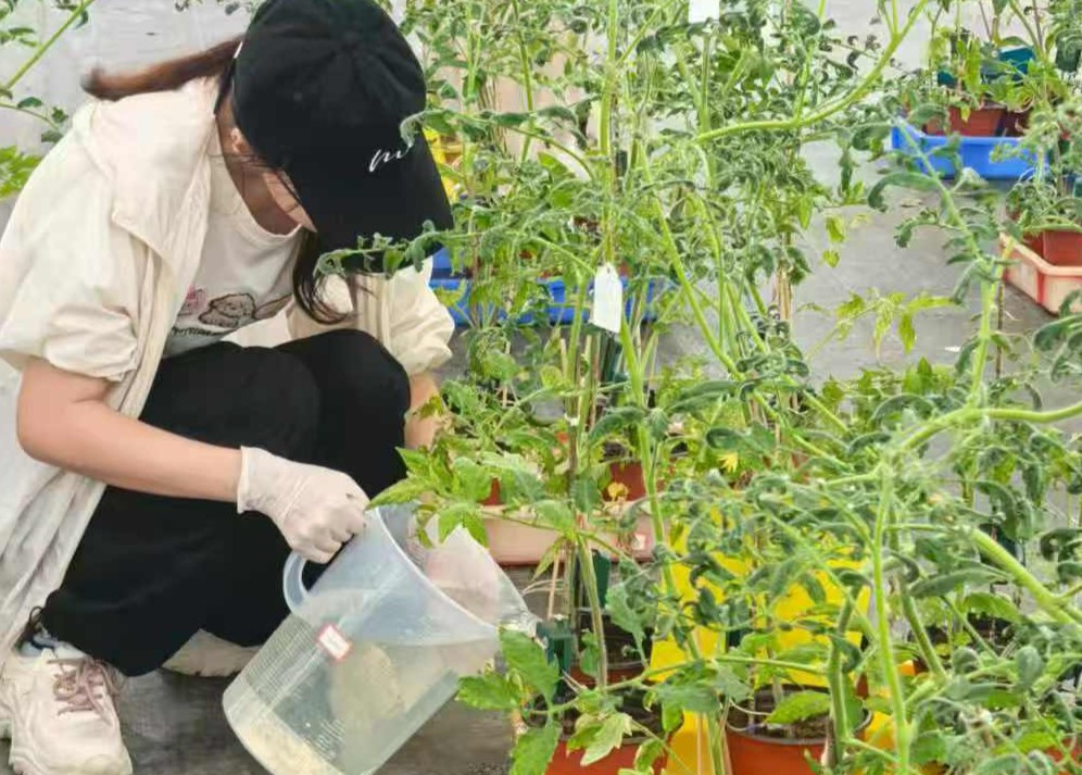 很快,團(tuán)隊(duì)分工行動(dòng)起來。在研究生學(xué)姐的帶領(lǐng)下,大家學(xué)著給番茄苗“戴手環(huán)”、調(diào)試數(shù)據(jù)傳輸設(shè)備。大棚里的番茄按科學(xué)方法分組,澆灌不同濃度含鉀、磷的營養(yǎng)液,探究這些元素對(duì)于植物生長的影響。以往做這類實(shí)驗(yàn),得靠人天天記錄、測量,既耗時(shí)間又容易出錯(cuò)。但有了PlantRing傳感器的助力后,番茄莖的直徑變化數(shù)據(jù)會(huì)實(shí)時(shí)上傳到云端,成員們使用自己的設(shè)備登錄專屬網(wǎng)站就能下載數(shù)據(jù),每株番茄的“生長日志”清晰明了。除了“依仗科技”,大家也沒落下手動(dòng)觀察:蹲在番茄株旁看葉片有沒有黃斑、根部是否發(fā)紫,數(shù)開花的數(shù)量,還用電子游標(biāo)卡尺測量莖的上下部直徑——微觀數(shù)據(jù)加宏觀觀察,才能讓實(shí)驗(yàn)結(jié)果更扎實(shí)。