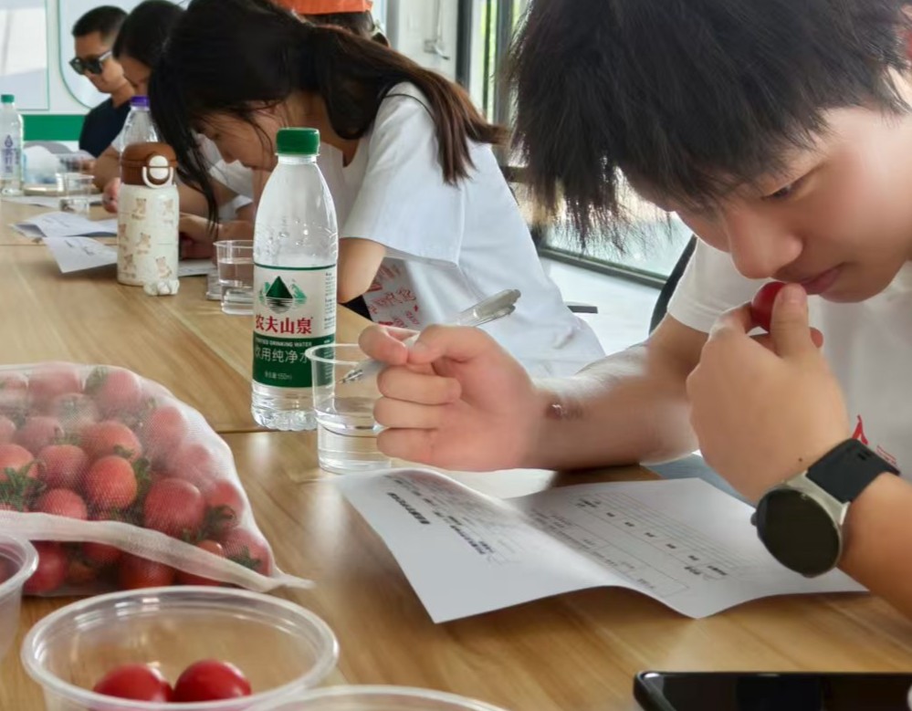 數(shù)周的實(shí)踐里,成員們每天鉆進(jìn)大棚:按計(jì)劃給番茄澆營養(yǎng)液、查看數(shù)據(jù)、記錄生長細(xì)節(jié),汗水浸濕衣衫是常事,但看著番茄從開花到掛果,心里滿是期待。實(shí)踐尾聲,團(tuán)隊(duì)摘番茄、盲測品鑒。大家把不同組的番茄分開,從甜度、果香、果肉細(xì)膩度三方面打分,最后一致發(fā)現(xiàn):經(jīng)過傳感器“精準(zhǔn)反饋灌溉”的那組番茄,甜度明顯更高,口感也更清甜。這既嘉獎(jiǎng)了付出汗水的每個(gè)人,也讓成員們直觀地感受到了智慧農(nóng)業(yè)的魅力。