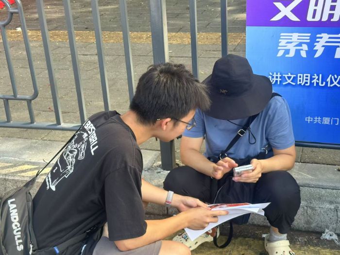 午后的廈大校門與黃昏的雙子塔觀景平臺,調研隊員敏銳捕捉著城市發(fā)展的生動注腳,成為一道流動的風景線。他們手拿提前準備好的問卷傳單,耐心邀請學生、商戶、游客、通勤族等多元群體參與問卷。大學生們熱烈討論著沙坡尾藝術展演帶來的文化滋養(yǎng),新廈門人則更關注閩南古厝保護中彰顯的城市文脈。