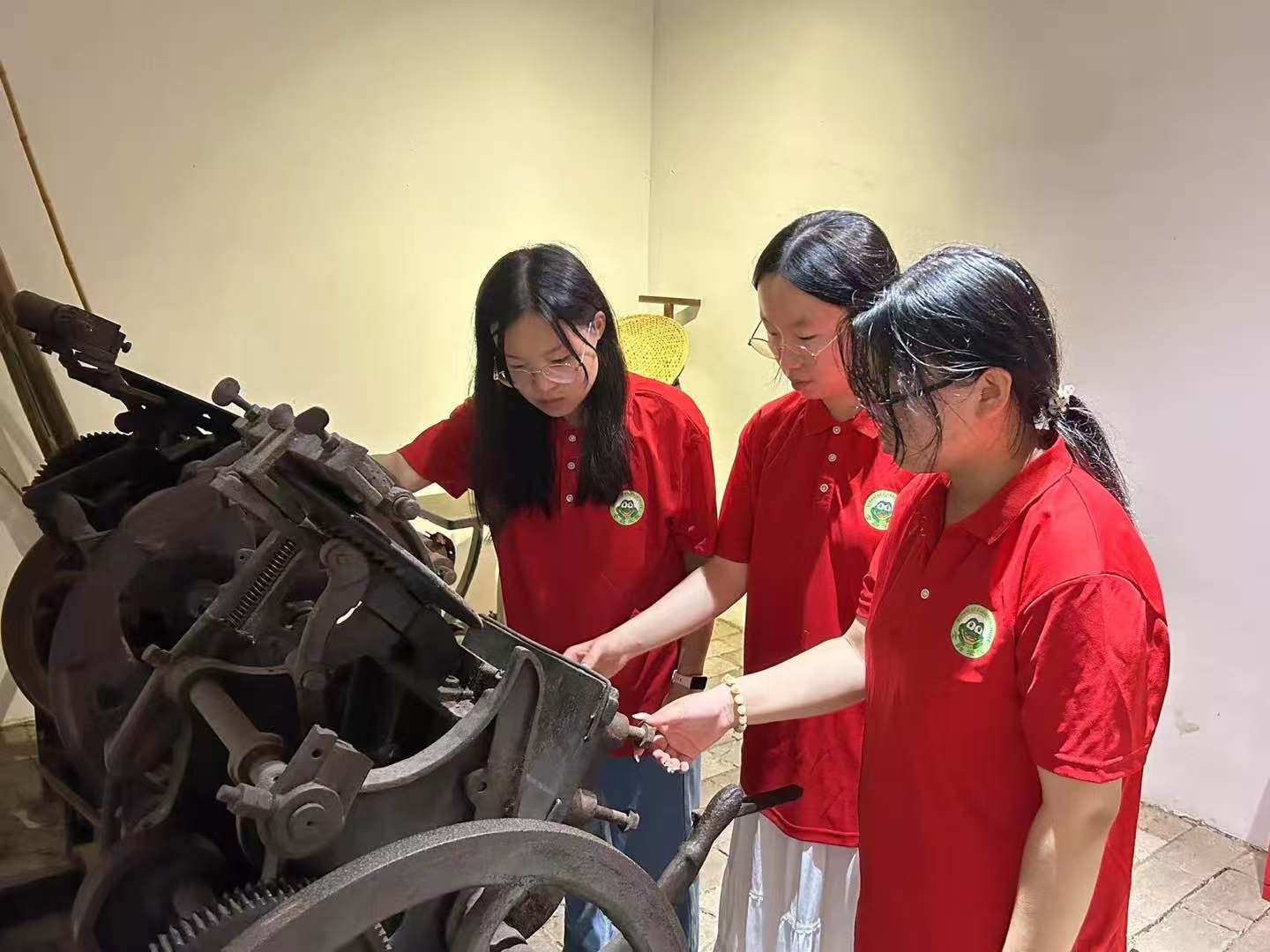 圖為團(tuán)隊成員參觀印刷機。供圖劉元竹