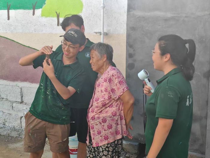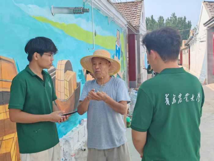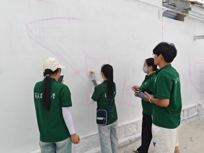 活動過程中,團(tuán)隊與當(dāng)?shù)攸h員、村民深度聯(lián)動:走進(jìn)黨員王合平家中聆聽歷史回響,與村鎮(zhèn)書記共同商議墻繪方案,向村民征求創(chuàng)作意見……從粉筆起稿、調(diào)色暈染到細(xì)節(jié)打磨,每一筆都凝聚著校地協(xié)作的心血。值得一提的是,隊員們還向村民展示了墻繪AR技術(shù),讓靜態(tài)畫作與數(shù)字科技碰撞出奇妙火花,為傳統(tǒng)文化傳播注入現(xiàn)代活力。