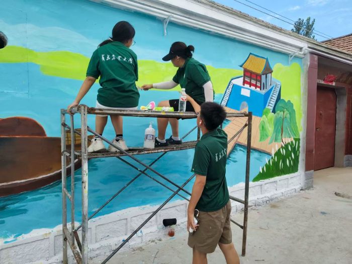 實踐團(tuán)首先扎根實地調(diào)研,深度挖掘四女寺鎮(zhèn)特有的“四女奉親 孝德文化與運河文化底蘊。在此基礎(chǔ)上,團(tuán)隊成員化身“文化畫師”,將傳統(tǒng)元素融入鄉(xiāng)村風(fēng)貌設(shè)計,通過細(xì)膩筆觸再現(xiàn)“四女奉親”的孝德典故,以濃墨重彩描繪運河往昔商船往來的繁華盛景。在短短十天內(nèi),隊員們高效完成了一系列精美墻繪作品,讓沉睡的歷史故事“躍”上墻面,將無形的文化遺產(chǎn)轉(zhuǎn)化為鄉(xiāng)村公共空間中可觸可感的文化景觀。
