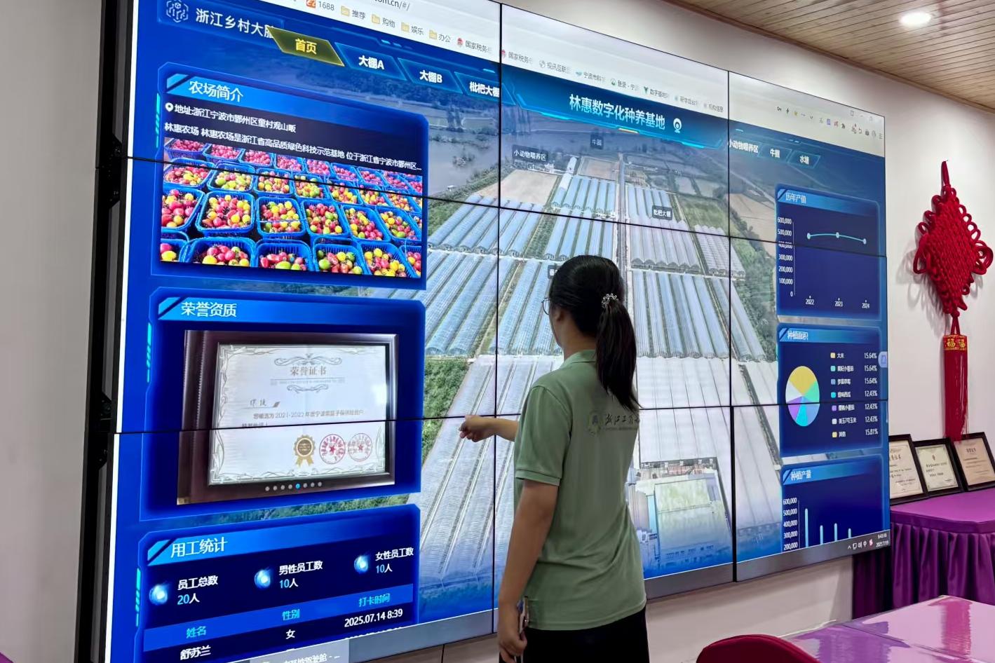 圖 8 實(shí)踐團(tuán)成員體驗(yàn)林惠農(nóng)場(chǎng)的數(shù)字大屏精準(zhǔn)管理