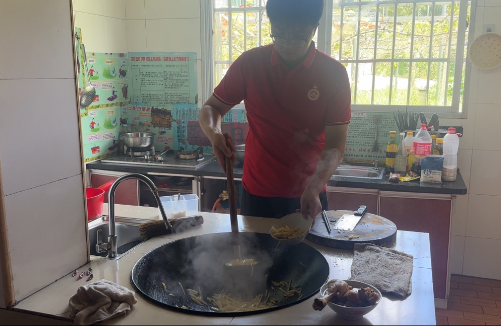 跨越三公里綠水青山,團隊抵達壩上紅軍村。老鄉(xiāng)提前備好新鮮食材,隊員們迅速分工:年輕姑娘們準備碗筷,小伙子們劈柴生火,有烹飪經(jīng)驗的劉宇同學(xué)系上圍裙掌勺,嫻熟地翻炒著土豆絲,灶膛里柴火噼啪作響,鐵鍋上熱氣升騰,飯菜的香味彌漫在屋中,贏得了眾人的稱贊。