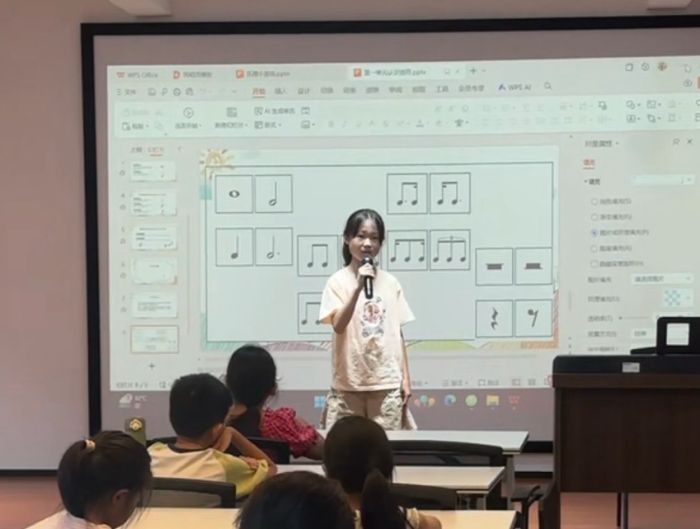 在合唱排練課正式開(kāi)始前,老師特別設(shè)置了“歌曲展示”環(huán)節(jié),邀請(qǐng)孩子們主動(dòng)上臺(tái)演唱自己熟悉的曲目。這一環(huán)節(jié)不僅為孩子們提供了展現(xiàn)自我的平臺(tái),更在輕松的氛圍中拉近了彼此距離,為后續(xù)課程的開(kāi)展奠定了良好基礎(chǔ)。