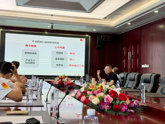 行政管理中心周璜經(jīng)理為實踐團(tuán)詳細(xì)介紹了公司的“礦業(yè)管理4.0”體系。作為推動管理升級的系統(tǒng)化工具,礦業(yè)管理4.0以“管理標(biāo)準(zhǔn)化”為核心,以“產(chǎn)業(yè)工人隊伍建設(shè)”為支撐,是在前期標(biāo)準(zhǔn)化管理基礎(chǔ)上的全面升級。