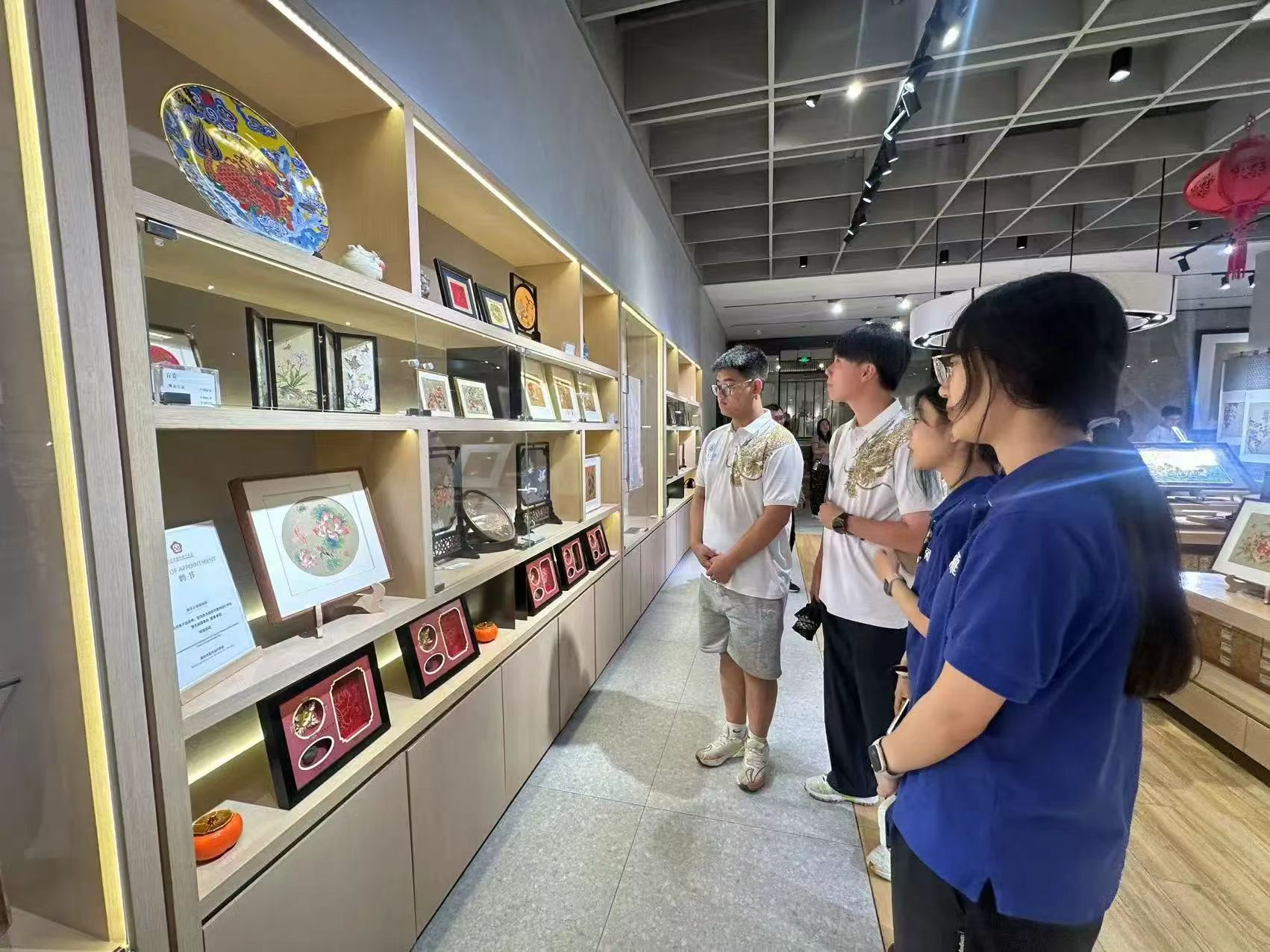 實踐隊首站走進(jìn)南京云錦博物館,開啟非遺文化探尋。作為“錦中之冠”,南京云錦自東晉“錦署”設(shè)立便綿延千年,明清官辦織造局的壟斷更使其集歷代織錦工藝之大成。在館內(nèi),隊員們驚嘆于“寸錦寸金”的極致工藝:純桑蠶絲為經(jīng),真金、純銀捻線為緯,需兩名工匠在大花樓木織機(jī)上配合,每日僅能織就數(shù)寸。二層演示區(qū),“通經(jīng)斷緯”“挖花妝彩”的“妝花”工藝現(xiàn)場呈現(xiàn),拽花工拉花本、織手引彩緯的協(xié)作,讓“逐花異色”的奇跡直觀可感。鎮(zhèn)館之寶“明萬歷皇帝龍袍妝花紗袍料”復(fù)制品尤為震撼:17米長的錦緞上,17條金龍以真金、孔雀羽線織就,復(fù)刻了失傳300多年的“紗地妝花織金”技藝,全球僅存兩件。而一層文創(chuàng)區(qū)將云錦紋樣融入現(xiàn)代服飾、家居的設(shè)計,更讓隊員們看到“古老技藝活在當(dāng)下”的創(chuàng)新路徑,讓隊員們明白傳承不是守舊,而是讓千年智慧與時代同行。