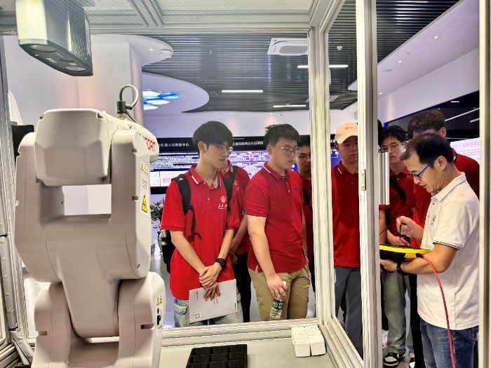 實踐隊深入生產(chǎn)一線,在語音交互智能碼垛工作站前進行深度技術觀摩。郭萬金老師結合現(xiàn)場全場景實操,詳細解析了從語音指令識別、機械臂運動學實時解算到末端執(zhí)行器精準抓取與排列的全流程。隊員們近距離觀察了機械臂的流暢運行軌跡與穩(wěn)定抓取性能,這正是“翼臂協(xié)凈”項目實現(xiàn)清潔作業(yè)臂精準控制與高效執(zhí)行所追求的核心能力。這種沉浸式體驗,使項目團隊對“指令-規(guī)劃-執(zhí)行”這一復雜鏈條中的關鍵環(huán)節(jié)(尤其是運動控制算法和實時反饋系統(tǒng))有了更為直觀和深刻的理解,為優(yōu)化項目技術路徑提供了直接啟發(fā)。