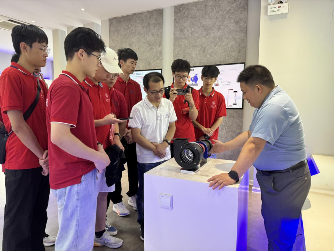 通過展廳詳實的資料和工作人員的深入講解,實踐隊系統(tǒng)梳理了磁輪聯(lián)軸器從初代到最新產(chǎn)品的迭代升級歷程,并通過豐富的應用案例分析,深刻感受到磁傳動技術的快速發(fā)展與廣闊前景。郭萬金老師現(xiàn)場進行了直連、二代、三代磁輪調(diào)速系統(tǒng)節(jié)能效果的對比演示,清晰展現(xiàn)了技術在能效提升上的顯著進步;永磁彈簧在電梯領域的模擬演示,則凸顯了磁技術在緩沖、減振方面的獨特優(yōu)勢。這些高效節(jié)能、免維護、長壽命的特性,正是“翼臂協(xié)凈”項目在追求設備耐用性、降低運行成本方面亟需突破的關鍵點。 深入車間觀摩工作機器的實際應用,隊員們更體會到將創(chuàng)新技術轉(zhuǎn)化為可靠產(chǎn)品的嚴謹與不易。
