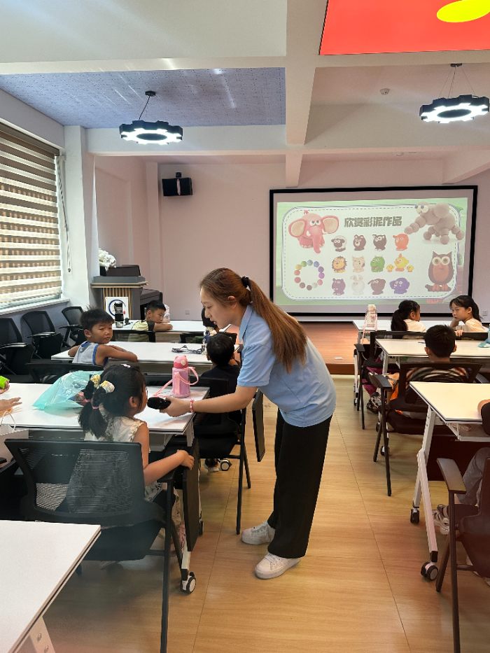 最受孩子們期待的動(dòng)手創(chuàng)作環(huán)節(jié)如期而至。志愿者老師為每個(gè)孩子分發(fā)了五顏六色的彩泥,并現(xiàn)場(chǎng)演示了搓、捏、揉、壓等基礎(chǔ)造型技巧。在志愿者的悉心指導(dǎo)下,孩子們充分發(fā)揮自己的想象力和創(chuàng)造力,認(rèn)真地?cái)[弄著手中的彩泥。不一會(huì)兒,一個(gè)個(gè)生動(dòng)有趣的作品便在孩子們的指尖誕生:有憨態(tài)可掬的小動(dòng)物、色彩斑斕的花朵、造型酷炫的汽車……每一件作品都充滿了童真童趣與奇思妙想。“看我做的小兔子!”“我捏了一個(gè)彩虹城堡!”孩子們興奮地向老師和小伙伴展示著自己的創(chuàng)作成果,小臉上洋溢著滿滿的自豪與喜悅。