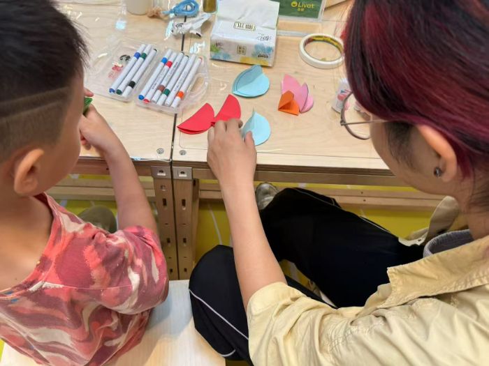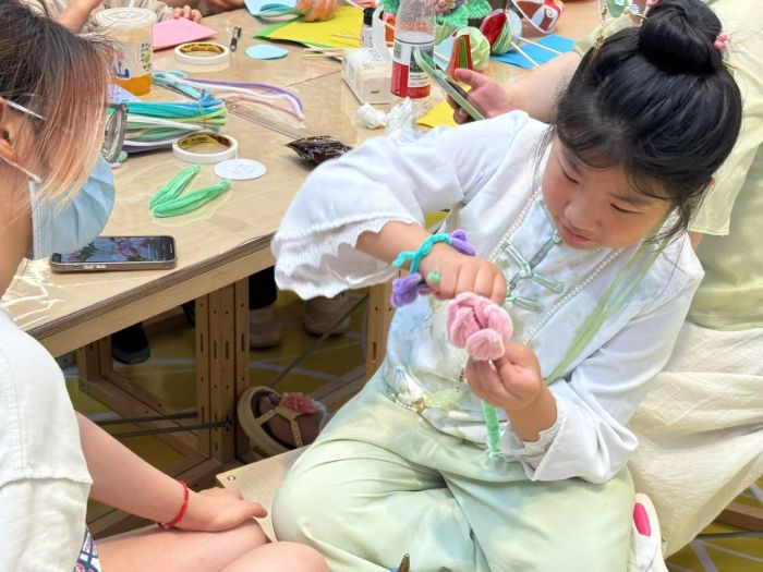 在非遺手工主題課程中,“絨花扭扭棒制作”“英雄臉譜藝術(shù)工坊”“傳統(tǒng)翻花巧手坊”三大體驗區(qū)人氣高漲。以色彩繽紛的扭扭棒替代傳統(tǒng)蠶絲,兒童在殘友與志愿者的指導(dǎo)下制作象征和平的絨花發(fā)簪,感受“永不凋零的匠心”;在臉譜繪制中,孩子們與搭檔將英雄人物的忠誠與堅韌化為視覺符號,用紅色詮釋勇敢,以特殊筆觸再現(xiàn)歷史記憶;傳統(tǒng)翻花則讓親子家庭在紙張的折疊、剪裁與翻轉(zhuǎn)中,體驗非遺技藝的靈動與趣味。