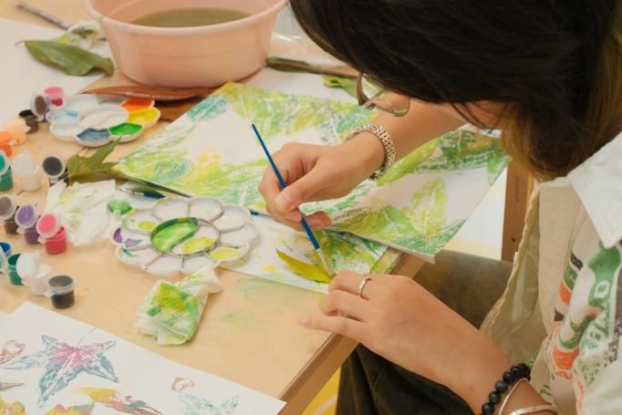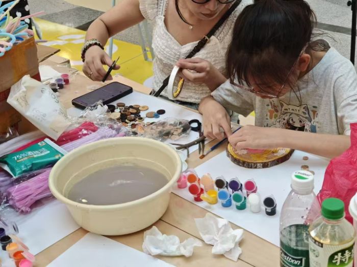 非遺課程之后,綠色環(huán)保手工主題“自然之痕”接力上線。“自然拓印工坊”里,參與者以落葉、花瓣為素材,通過傳統(tǒng)植物拓染技藝,將自然脈絡(luò)轉(zhuǎn)化為獨一無二的生命印記;“石上生花創(chuàng)作區(qū)”中,洗凈的鵝卵石、圓木片成為基底,回收的紐扣、樹枝、毛線經(jīng)拼貼、上色,變身為充滿想象的裝飾與掛畫。兩大環(huán)節(jié)讓參與者在動手實踐中重新審視廢棄物的價值,尤其幫助兒童建立資源循環(huán)意識。